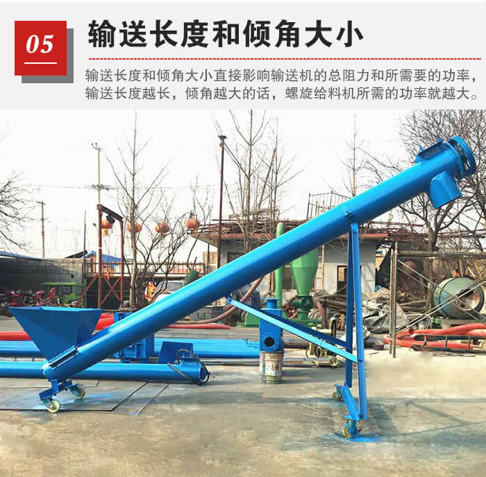 輸送長度和傾角大小直接影響輸送機的總阻力和所需要的功率,輸送長度越長,傾角越大的話,螺旋給料機所需的功率就越大,所以在選型時需要說明這一點。