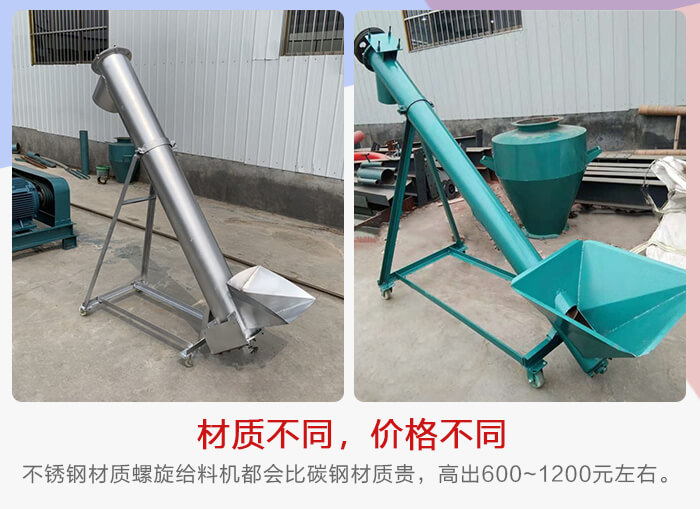 螺旋給料機(jī)可以分為碳鋼和不銹鋼材質(zhì)兩種,由于這兩者材質(zhì)成本有差異,碳鋼螺旋給料機(jī)適合普通物料輸送,不銹鋼螺旋給料機(jī)主要用于輸送機(jī)一些腐蝕性、高溫物料,也用于食品、醫(yī)藥等對(duì)輸送環(huán)境有衛(wèi)生標(biāo)準(zhǔn)的行業(yè),所以不銹鋼材質(zhì)螺旋給料機(jī)都會(huì)比碳鋼材質(zhì)貴,一般會(huì)高出600~1200元左右。