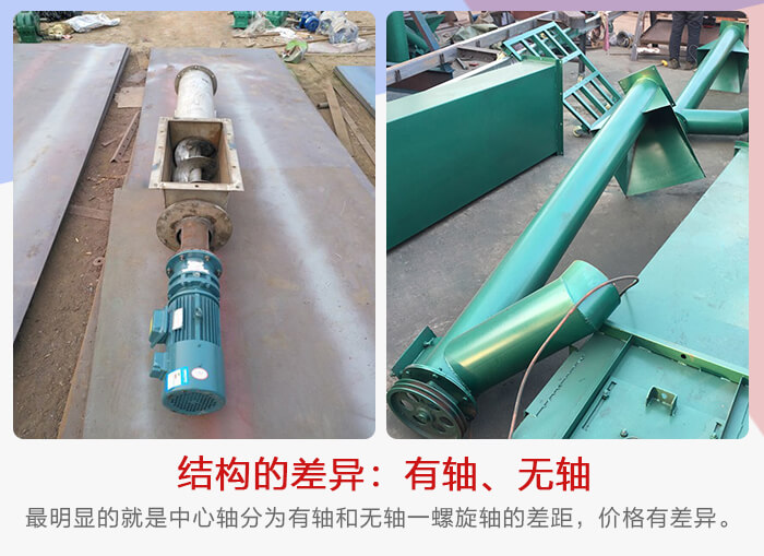 移動式螺旋輸送機(jī)在結(jié)構(gòu)特點(diǎn)上其是有所差距的。其中最明顯的就是中心軸分為有軸和無軸,雖然他們就只有一螺旋軸的差距,但是價格還是有幾百甚至上千元的差異,具體差異要以型號差異為主。