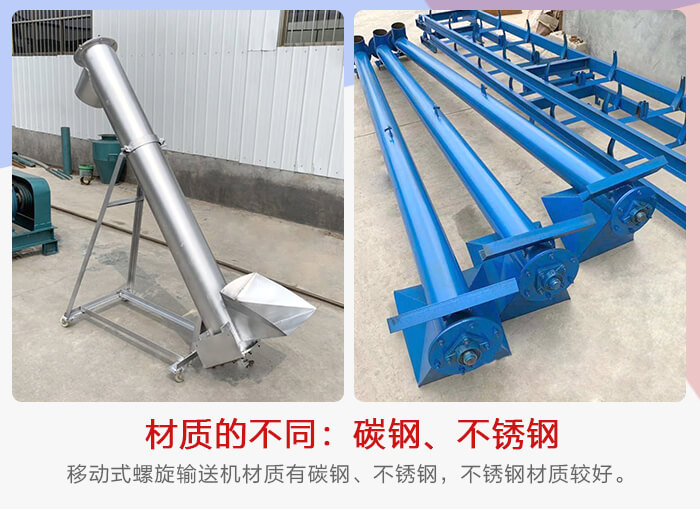 移動式螺旋輸送機(jī)材質(zhì)有碳鋼、不銹鋼,不銹鋼材質(zhì)的價格要貴1倍左右,不銹鋼的主要用于對輸送環(huán)境要求高的行業(yè),清潔度高,不會污染物料,使用時間長,造價也相對高。碳鋼材質(zhì)可以主要應(yīng)用在一些對物料要求不是很嚴(yán)格或?qū)Γ菪斔蜋C(jī)的衛(wèi)生沒什么特別要求的地方,例如:一些煤炭,石灰,石子等一些顆粒狀的行業(yè)。