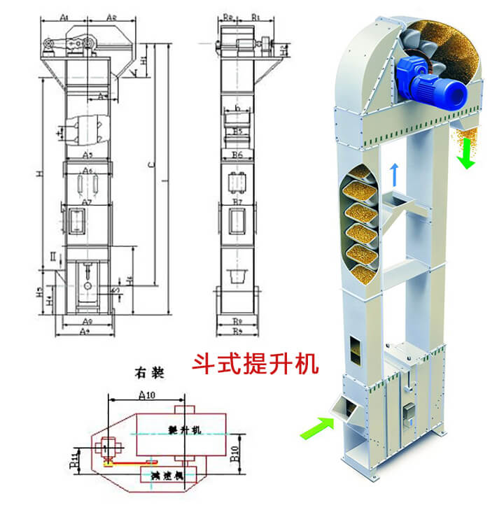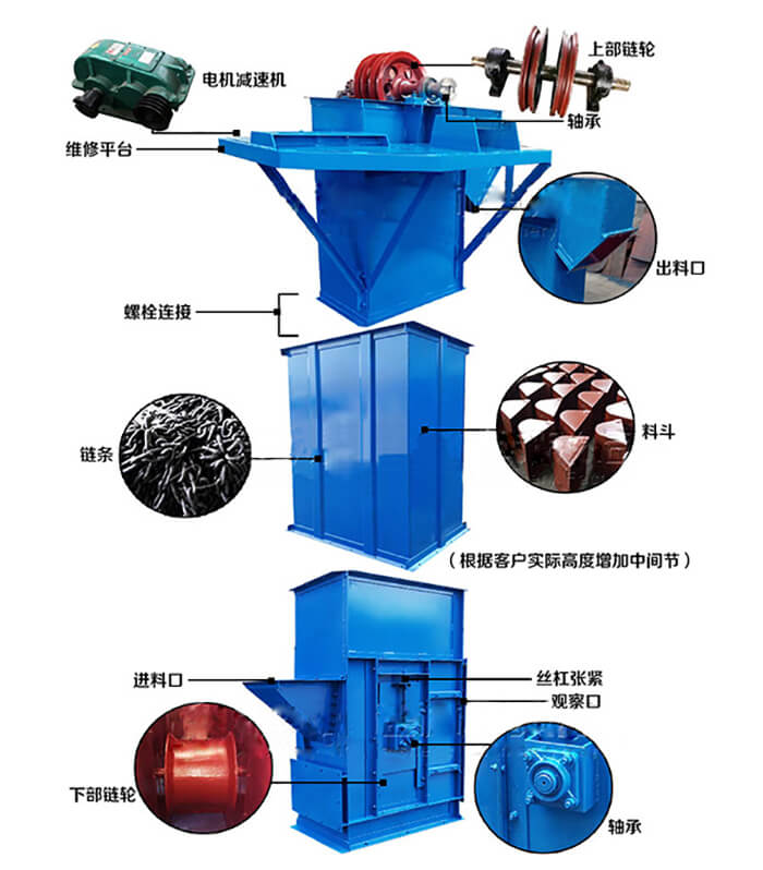 斗式提升機(jī)由料斗、驅(qū)動(dòng)裝置、頂部和底部滾筒、膠帶 、張緊裝置和機(jī)殼等組成。