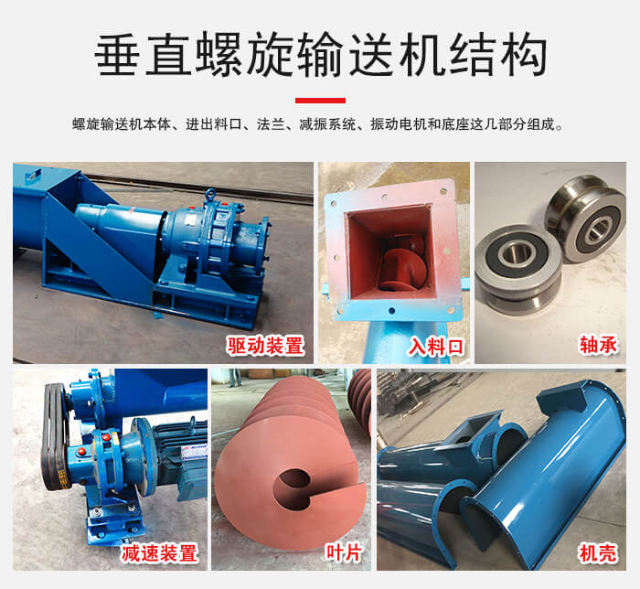 垂直螺旋輸送機(jī)螺旋輸送機(jī)本體、進(jìn)出料口、法蘭、減振系統(tǒng)、振動(dòng)電機(jī)和底座這幾部分組成。