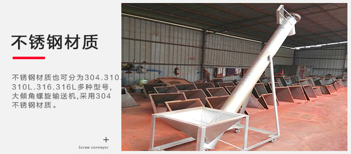 不銹鋼材質也可分為304.310.310L.316.316L多種型號,大傾角螺旋輸送機,所有的機型都可以采用304不銹鋼材質,但是當輸送距離長時,表面積增大,打磨難度增加,一般會選擇噴砂,從視覺上就不會像常見的不銹鋼那樣光亮,但質量不會有影響。