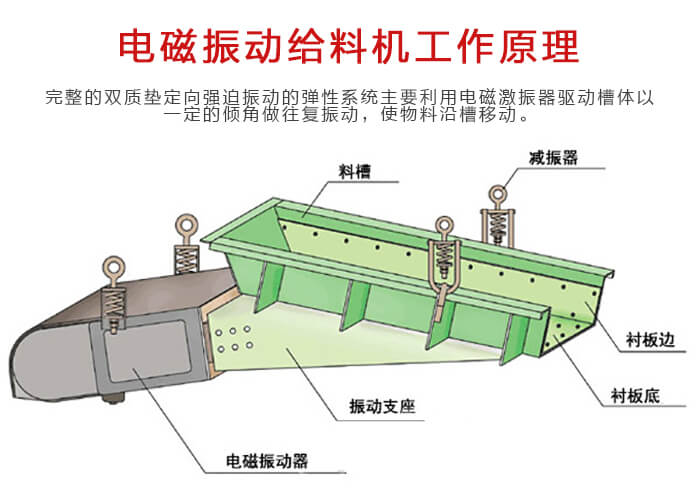 電磁振動給料機是一個較為完整的雙質墊定向強迫振動的彈性系統, 整個系統工作在低臨界共振狀態,主要利用電磁激振器驅動槽體以一定的傾角做往復振動,使物料沿槽移動。