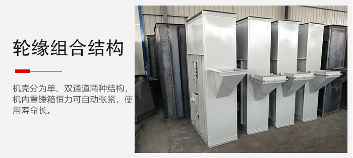 整機機殼分為單、雙通道兩種結(jié)構(gòu),機內(nèi)重錘箱恒力可自動張緊,鏈輪為可更換輪緣組合式結(jié)構(gòu),更換簡便;使用壽命長,