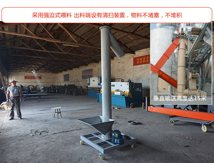大漢垂直立式螺旋輸送機采用的是強迫式喂料,在出料端安裝有清掃裝置,輸送中物料不堵塞,不堆積;采用垂直(90°)或大傾角輸送,節省占地面積,垂直輸送高度可達15米,可根據需求選擇。