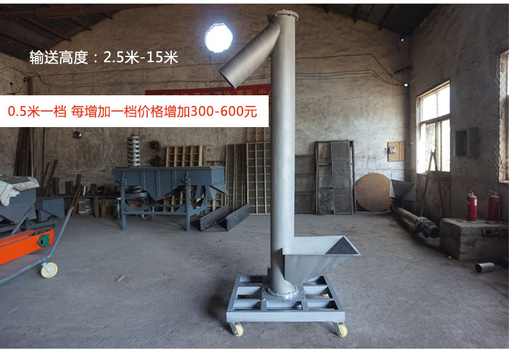 垂直螺旋輸送機的輸送高度在2.5米-15米;每0.5米為一檔,每增加一檔,價格增加300-600元,大家可根據(jù)需要選擇高度。