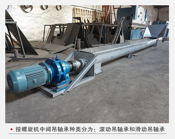 按螺旋機(jī)中間吊軸承種類分為:M1—為滾動(dòng)吊軸承,采用80000型密封軸承,軸蓋上另有防塵密封結(jié)構(gòu),常用在不易加油,不加油或油對(duì)物料有污染的地方,密封效果好,吊軸承壽命長(zhǎng),輸送物料溫度≤80℃(訂貨時(shí)可不注明)。M2—為滑動(dòng)吊軸承,設(shè)防塵密封裝置,常用在輸送物料溫度比較高(>80℃),或輸送液狀物料