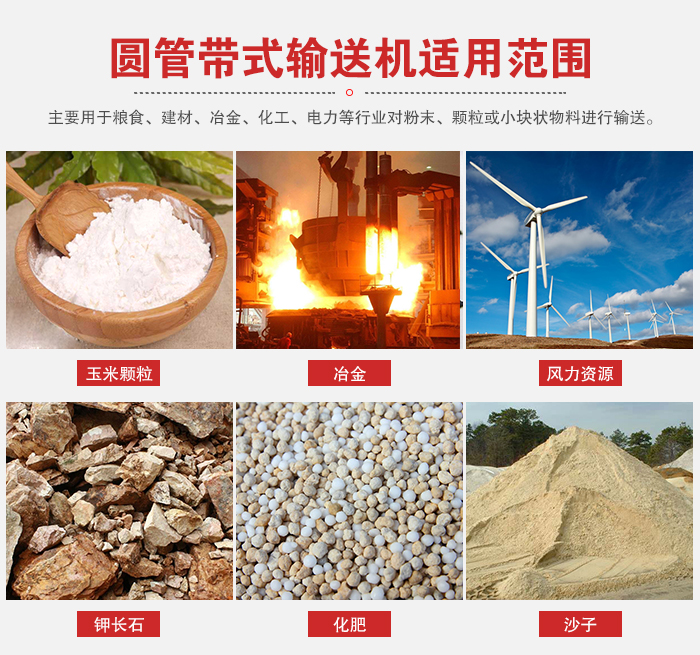 圓管帶式輸送機主要用于糧食、建材、冶金、化工、電力等行業對粉末、顆粒或小塊狀物料進行輸送任務,如水泥、混凝土、飼料、化肥、粉煤灰等物料,不宜輸送易變質的、粘性大的、塊度大的及易結塊的物料。