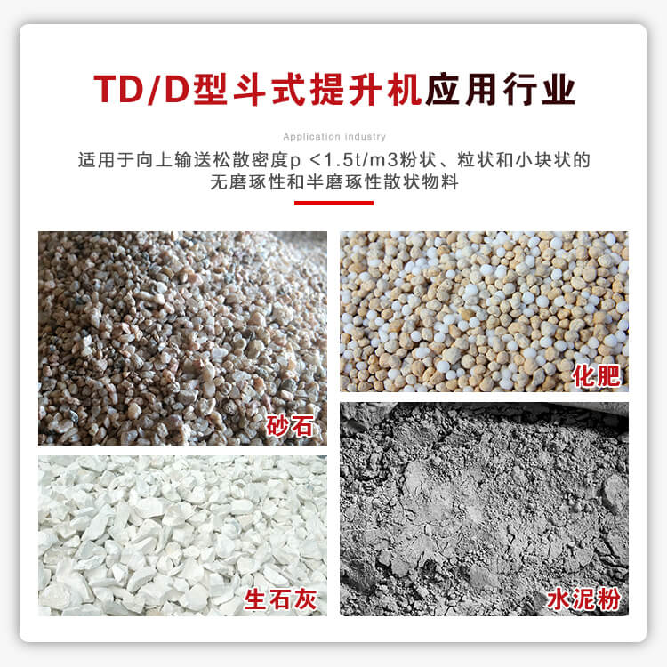 應(yīng)用行業(yè):TD型斗式提升機(jī)適用于向上輸送松散密度p <1.5t/m3粉狀、粒狀和小塊狀的無磨琢性和半磨琢性散狀物料 ,如煤、砂、焦末、水泥、碎礦石等。