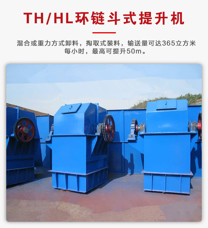 TH/HL環(huán)鏈斗式提升機(jī)牽引機(jī)構(gòu)是兩根環(huán)形鏈條,為混合或重力方式卸料,掏取式裝料,輸送量可達(dá)365m3/h,最高可提升50m。